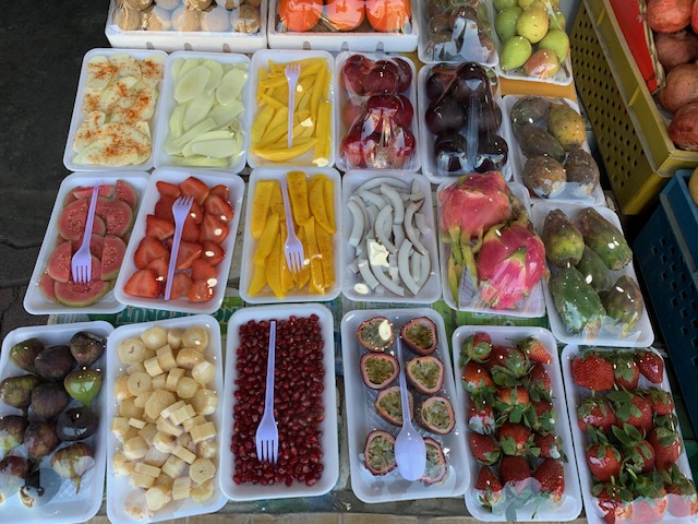 Amongst the gloss and the colour of the fruit stalls we saw lots of pre-cut fruits, so many, all sitting packaged with forks and spoons and tempting to the passerby, but we were a little confused as to what was going on, it’s a bit hard to walk and eat (as we were finding out), until we witnessed first hand how it all works here… road snacks!!