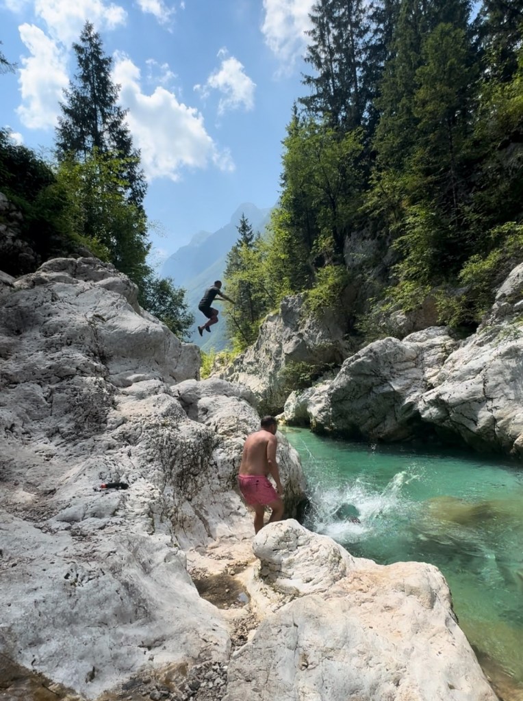 It’s fair to say that the Soča was even colder and tastier – and saltier! – than the aforementioned Vipava but that did not deter the more intrepid amongst us from whiling away the hours and days in 7 degree alpine water wading, floating and jumping, not even deterred by an apparent case of hypothermia setting in.
